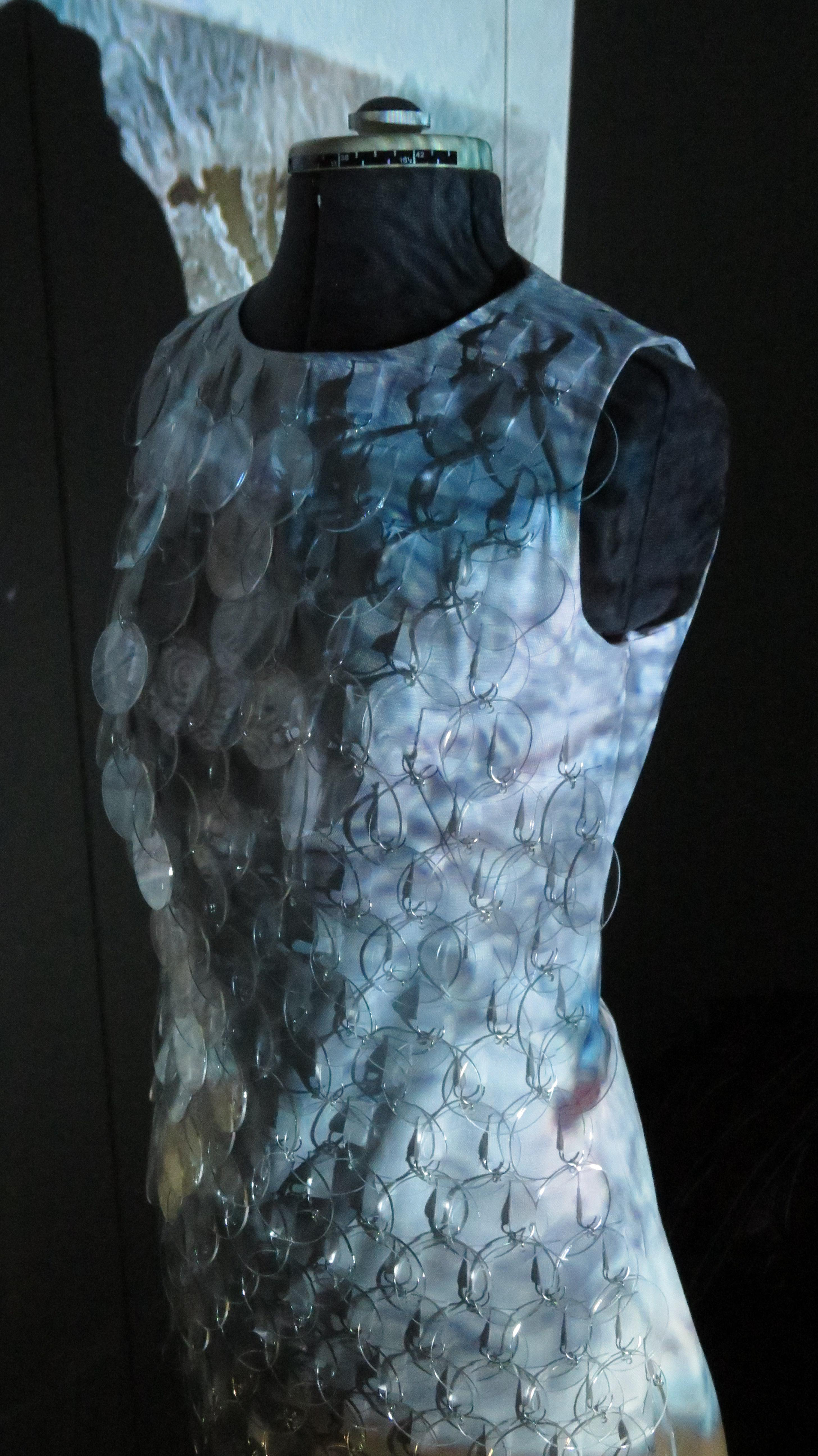 I created the dress out of a structured material that could support the disks. I then attached the disks with a slight overlapping patterns to reflect light better.